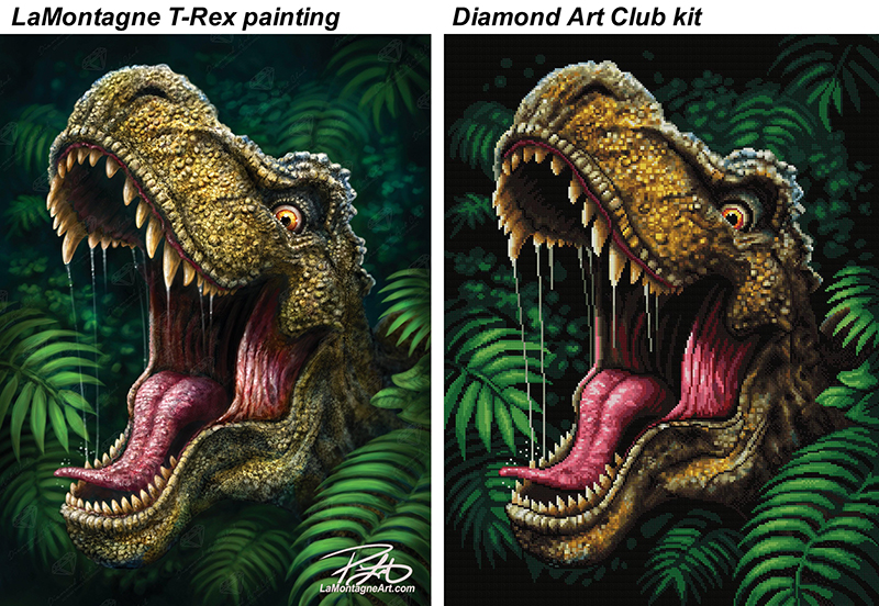This one is 22″ X 29″ (55.8cm x 73.7cm) Square with 48 colours including 3 Aurora Borealis colour. The T-Rex is now available! You can see and